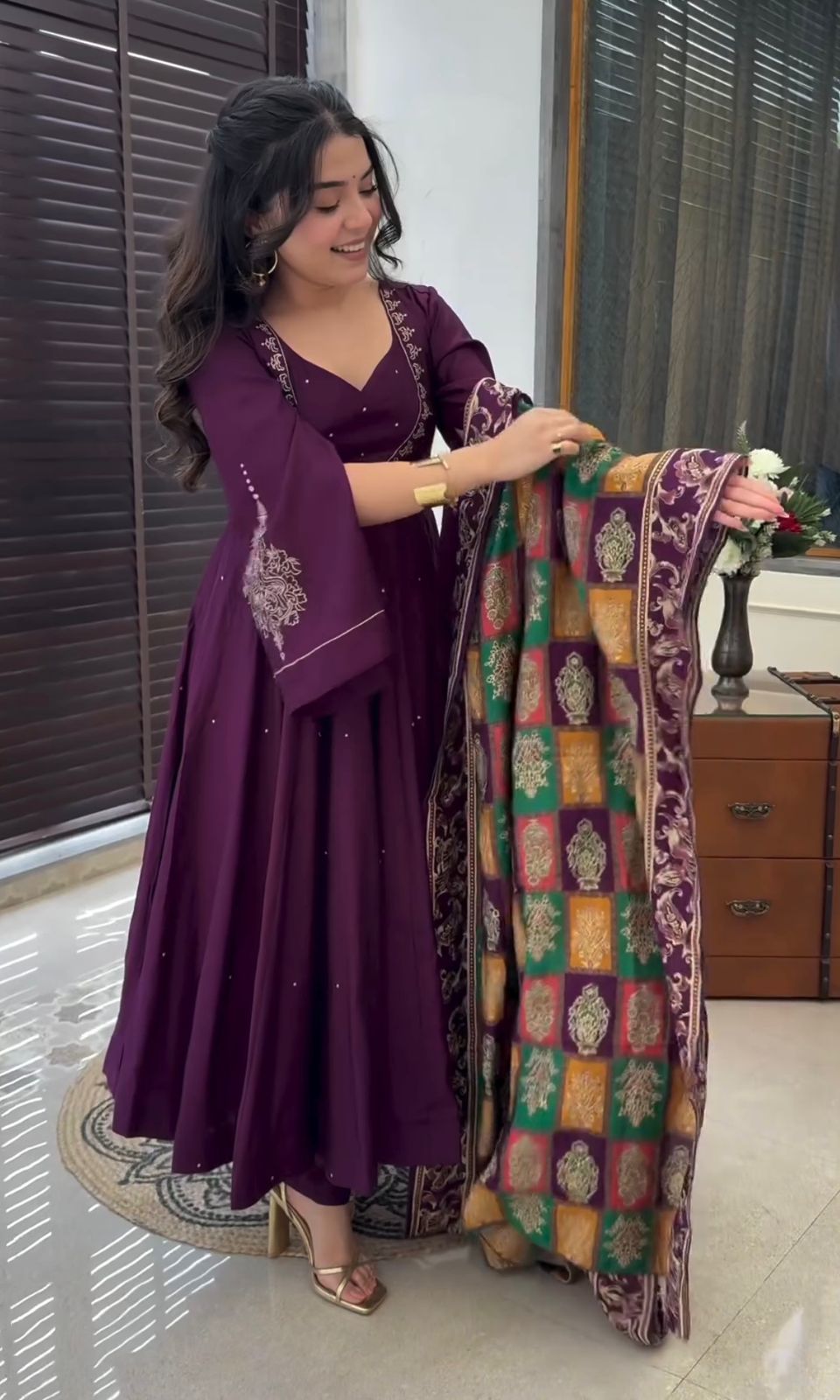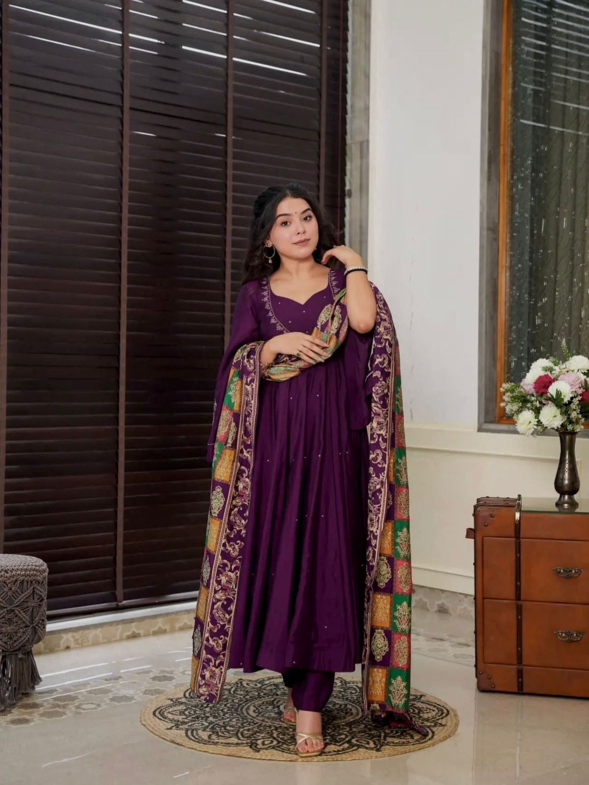 Peaceful Purple Color Chinnon Silk Embroidery Work Salwar Suit