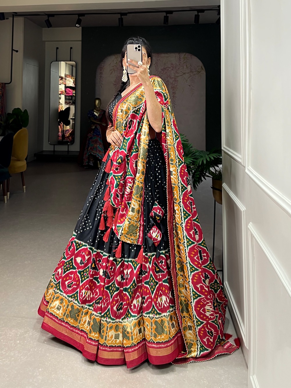 LNB 1684 Black Color Tussar Silk Patola Printed Lehenga Cho Festive Party Wedding, Events etc. Delivery 4-6 Working Days @2549/- | Lehenga, Bollywood Lehenga, Creative Lehenga, Designer Lehenga, Embroidered Lehenga, Party Wear Lehenga
