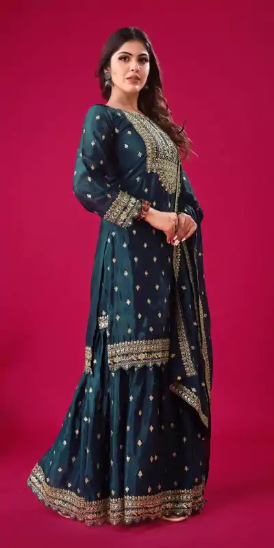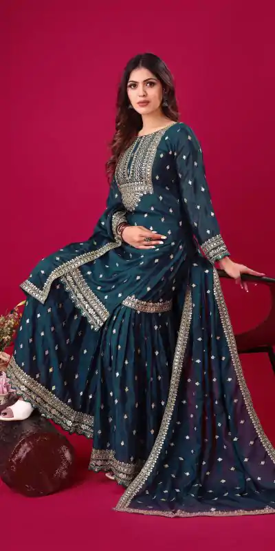 Fabrics | Top Fabric : Heavy Chinon Silk With *Heavy Embroidery Sequence Work with Sleeve Top Inner :Heavy Micro Cotton Top Length : 43-44 Top Size. : Free Size Semi Stitched (Fully Stitched Complete Ready To Wear)Sharara Fabrics : Heavy Chinon Silk With Heavy Embroidery Sequence Work With Flair Sharara Length:40-41 Inch (fully stitched) Dupatta Fabric : Heavy Chinon Silk With *Heavy Embroidery Sequence Work and Lace Border |