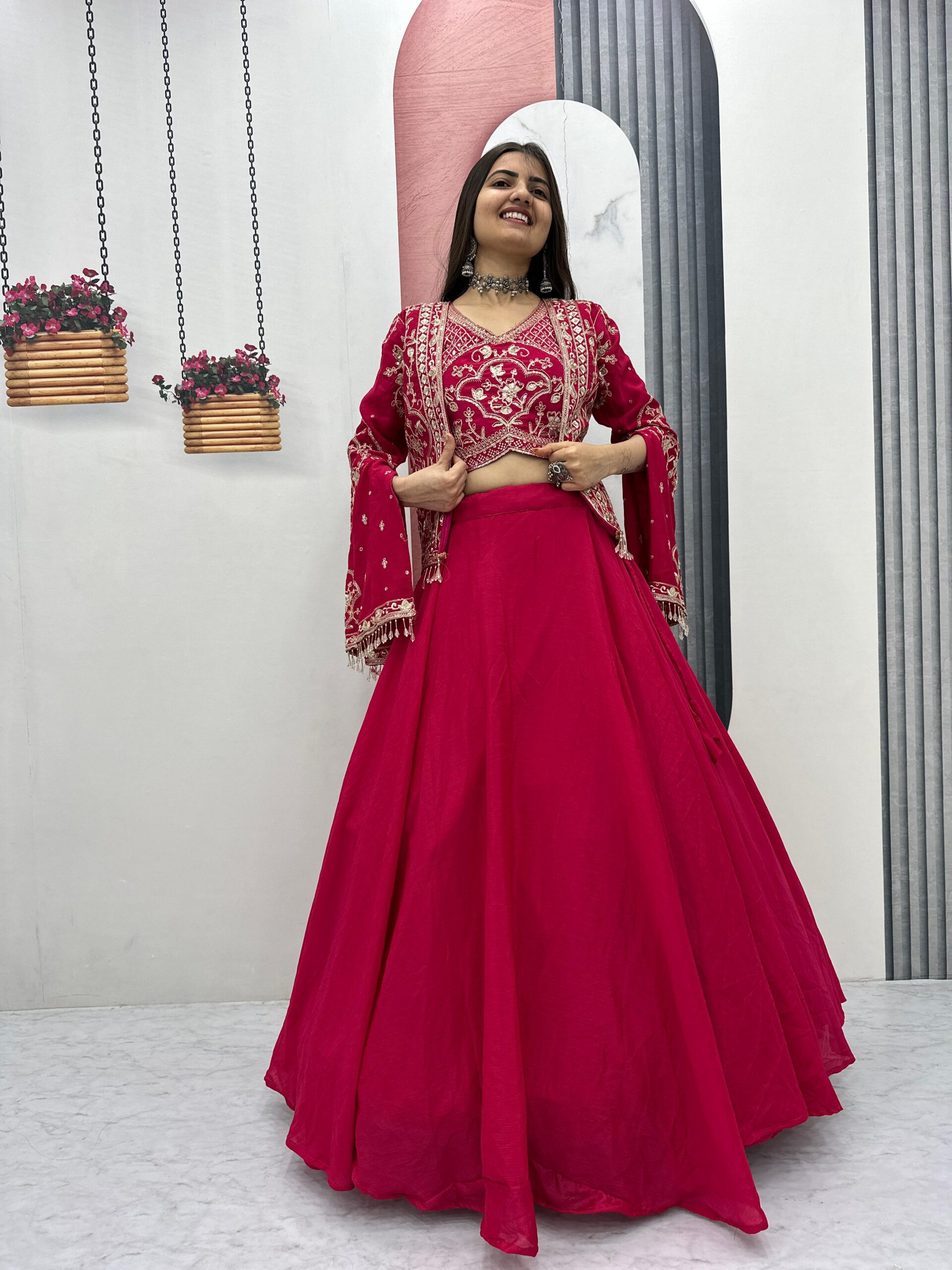 Pink Chinon Silk Thread Work Lehenga Choli