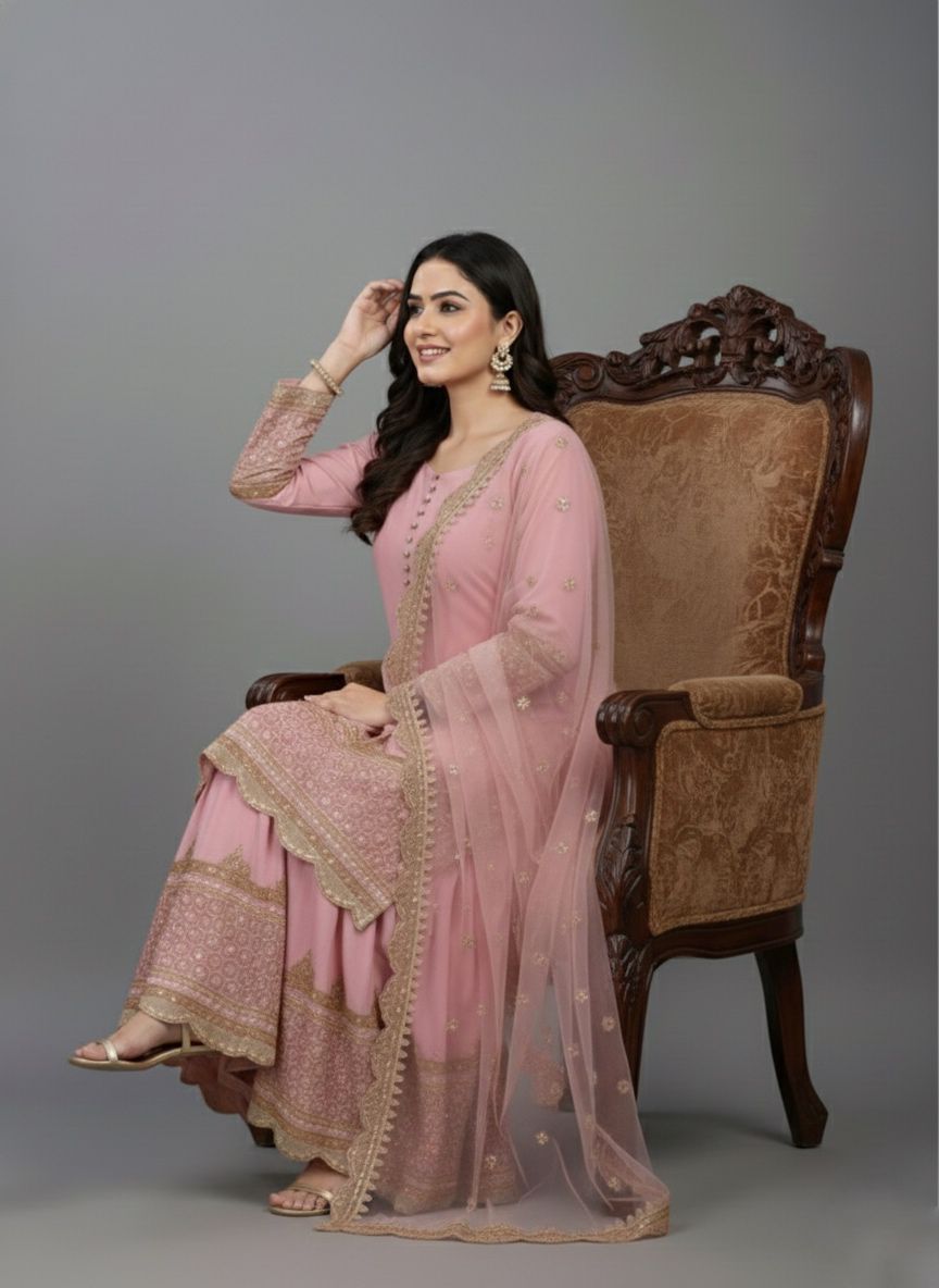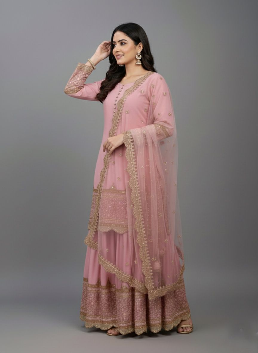 Top : Heavy Faux Georgette With Heavy 5mm Embroidery Sequence Work With Full Sleeve and Potli Button Inner : Heavy Micro cotton Length : 37-38 Inch Size : Free Size Work :Embroidery Sequence Work Type : Semi Stitched Palazzo :Heavy Faux Georgette With 5mm Embroidery Sequence Work With Fully Flair Palazzo inner :Heavy Micro Cotton Palazzo Length:40-41 InchDupatta : Heavy Net With 5mm Embroidery Sequence Work and Lace Border |