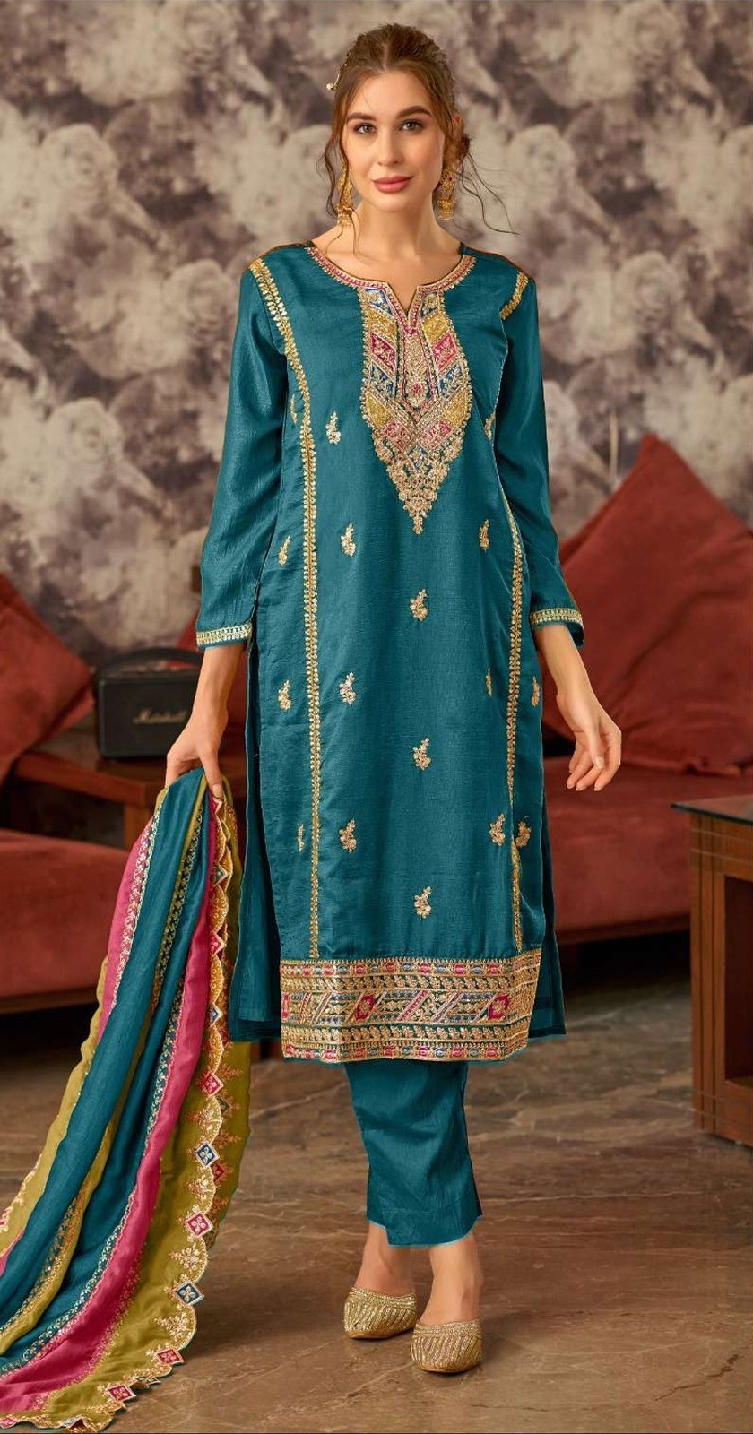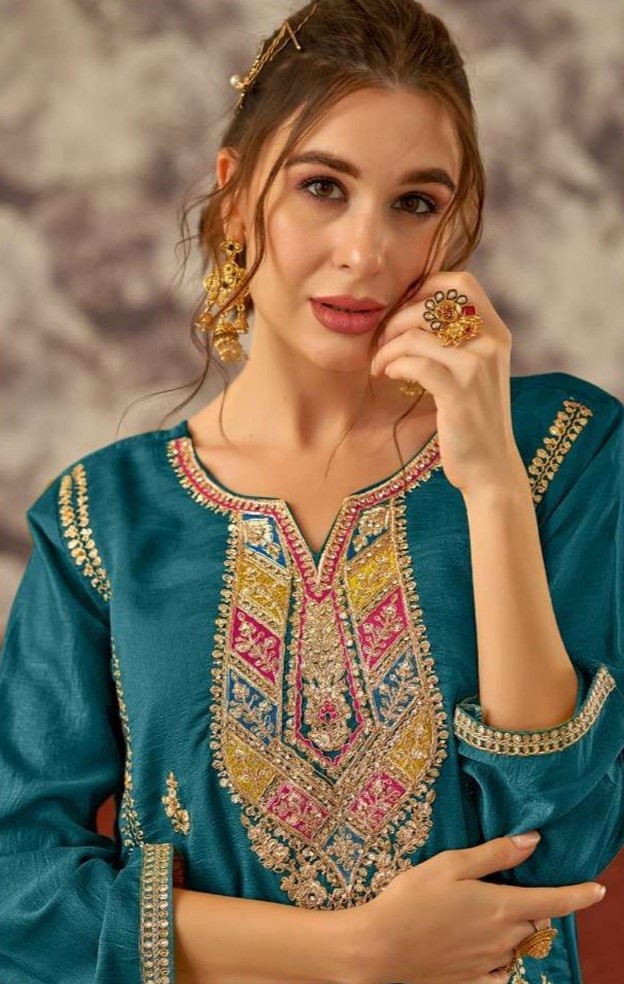 Fabrics | Top :Heavy PV Vichitra With Embroidery Codding Sequence Work With Jarkan Bottom :- Heavy Dull Santoon Inner :- Heavy Dull Santoon Dupatta :-Heavy PV Vichitra With Embroidery Codding Sequence Work With Latkan Size :- Max Up To 54″ |