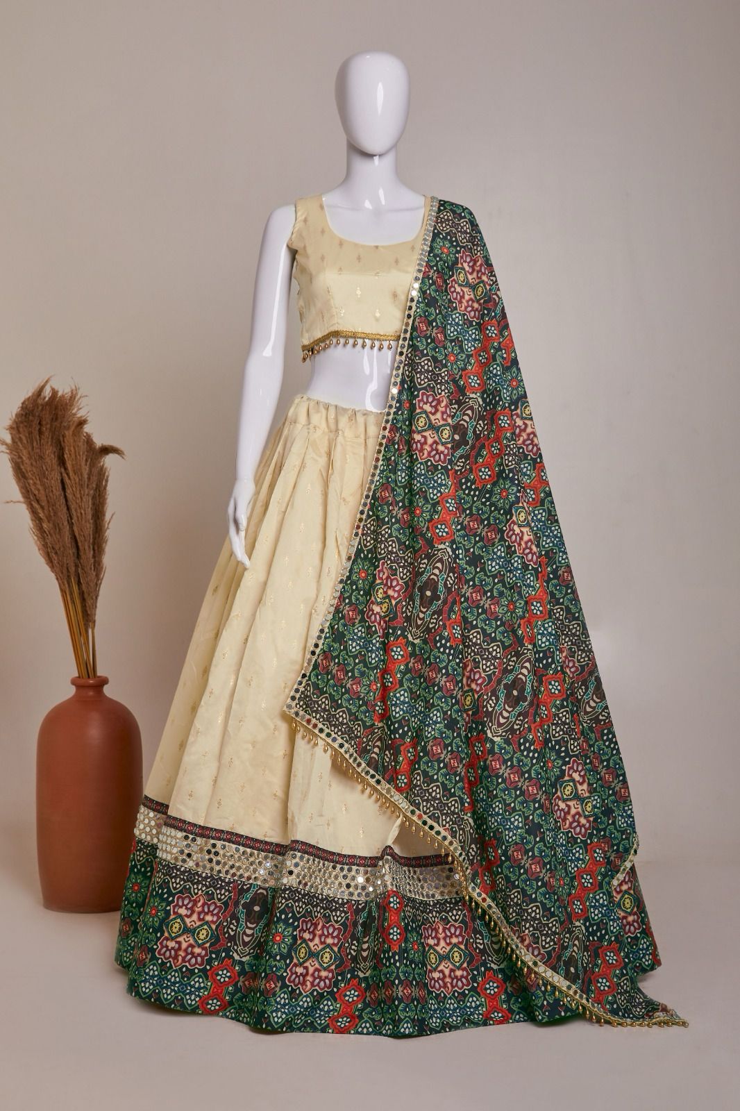 Cream Jaccard Silk Embroidery Printed Lehenga Choli