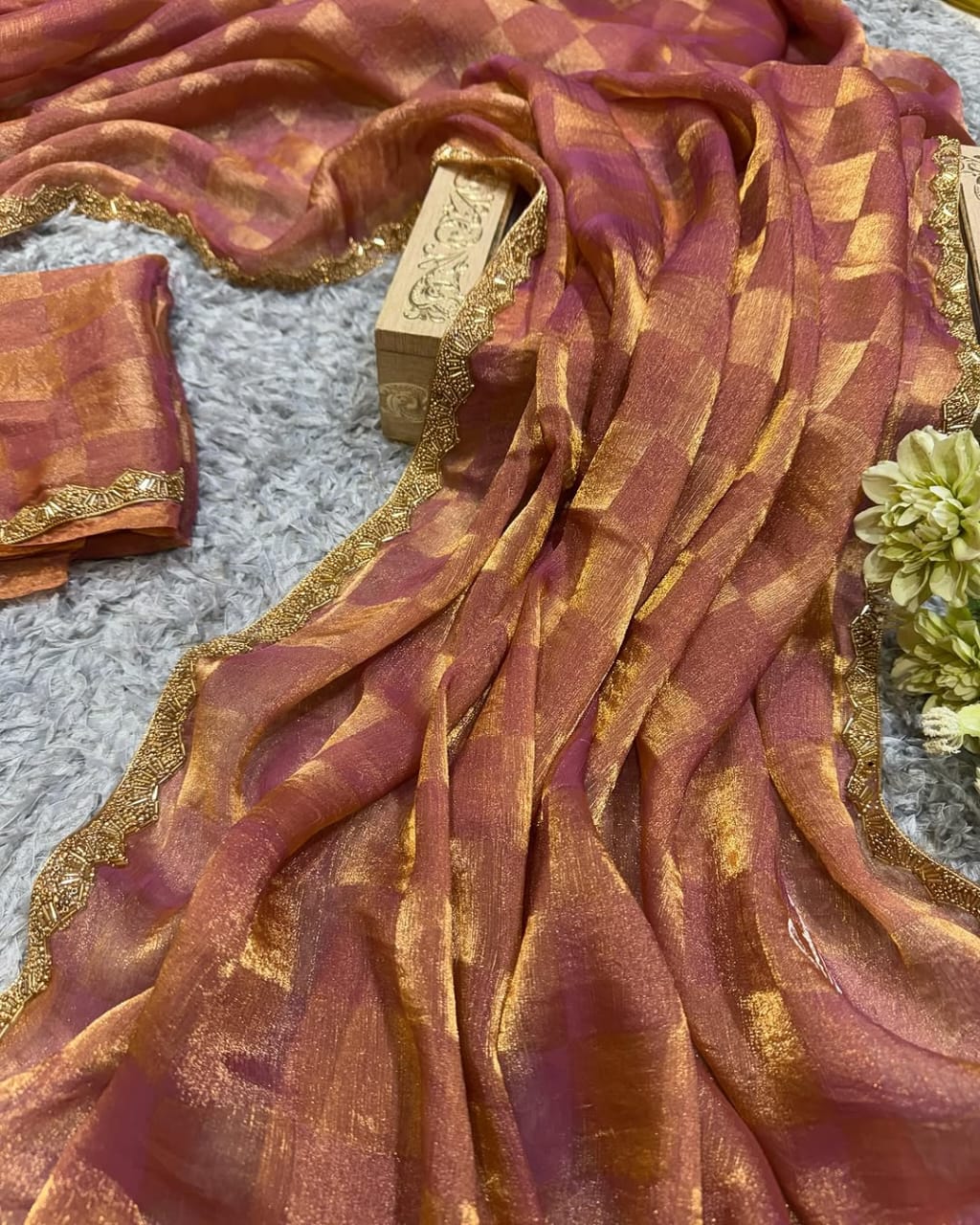 Fabrics | Saree Fabric :Fendi Chiffon Saree Work : Handwork Lace Saree : 5.5 Mtr Blouse Fabric : Running Blouse Blouse: 0.80 Mtr |