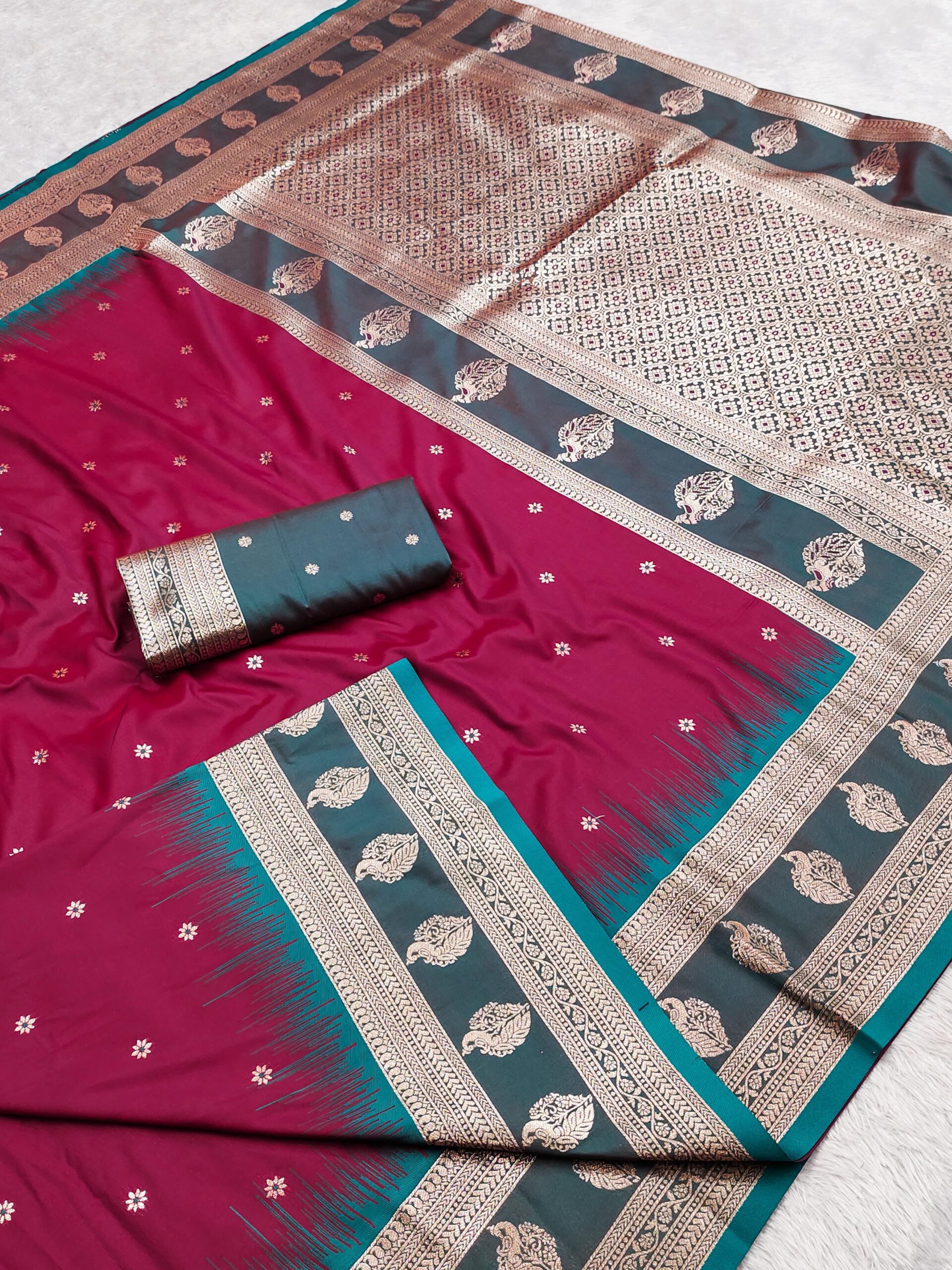 rich body adorned with zari butti weaving all over. The saree is highlighted with a contrast Banarasi border woven with traditional paisley motifs in rich gold zari And Comes with a grand Meenakari woven pallu.