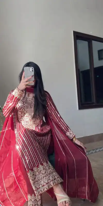 Fabrics | Top Fabric :- heavy Fox Georgette Work :- Heavy Embroidery With Thread & Sequence Work Inner :- Butter Crap Size :-Free Size Semi Stitched Length : 42-43 Inch Bottom Palazzo Fabric :- heavy Fox Georgette . Inner :-butter Crap Length : 40-41 inch Dupatta Fabric :- heavy Fox Georgette With Embroidery Work Size :- 2.10.meter |
