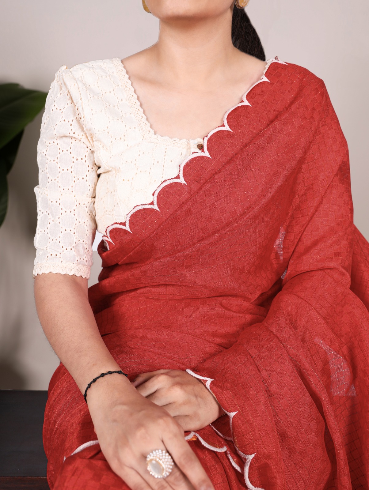 Saree Saree fabric : Gadhawal Chex Saree work : Arca Work Saree length : 5.5 meter Blouse (Stitched) Blouse Fabric : Cotton Blouse work : Lucknowi Work Blouse Size : Fully Stitched Size is 40 there Extra Margin So Customer Can Adjust from 38″ to 42″ Blouse Length : 15 Sleeve Length : 13 |