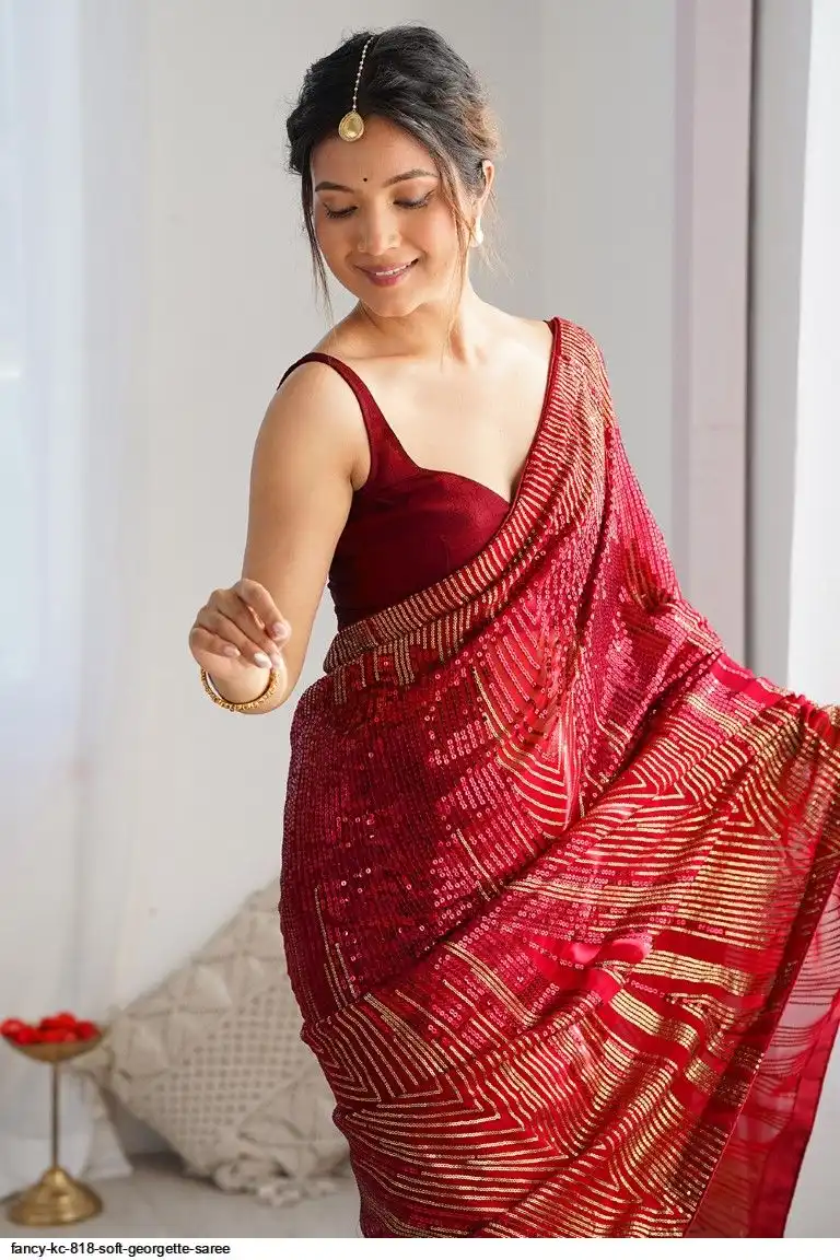 Red Georgette Sequence Lace Work Saree