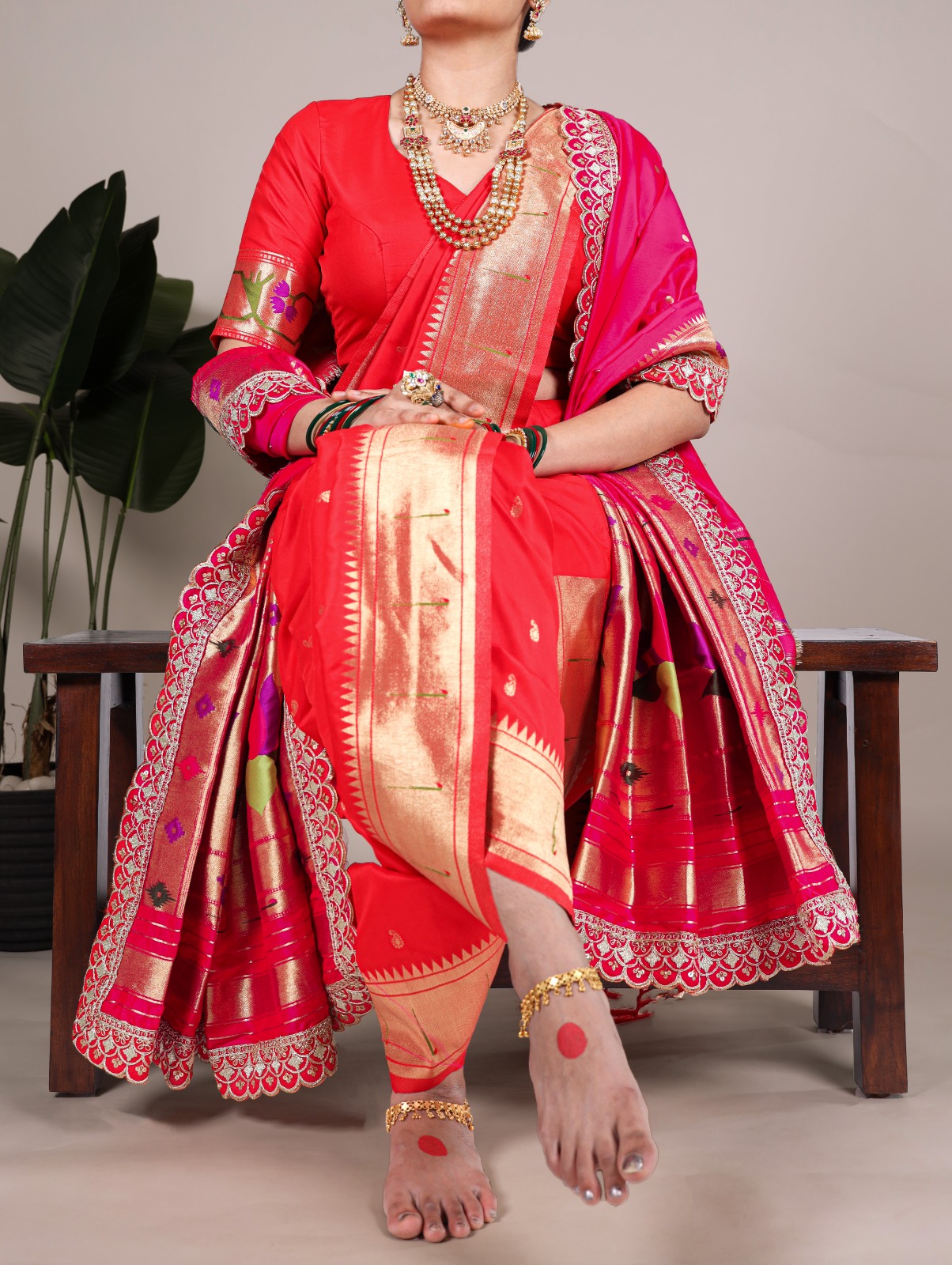 YNF 7407 Red Color Jacquard Silk Paithani Zari Weaving Work Saree Casual, Wedding, Festive, Events . Expected Delivery  4-6 Working Days @3349/- only                                                                                | Sarees, Bollywood Sarees, Creative Sarees, Designer Sarees, Embroidered Sarees, Ethnic Saree, Modern Digital sarees, Party Wear Sarees