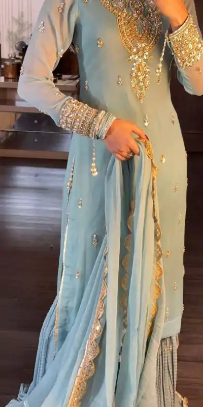 Fabrics | Top Fabric : Heavy Faux Georgette With Heavy Embroidery Sequence Work With Beads Work With Full Sleeve Top Inner : Heavy Micro Cotton Palazzo Fabrics : Heavy Faux Georgette With Crease And Lace Border With Elastic Dupatta Fabric : Heavy Faux Georgette With Embroidery Sequence Work With Lace Border |