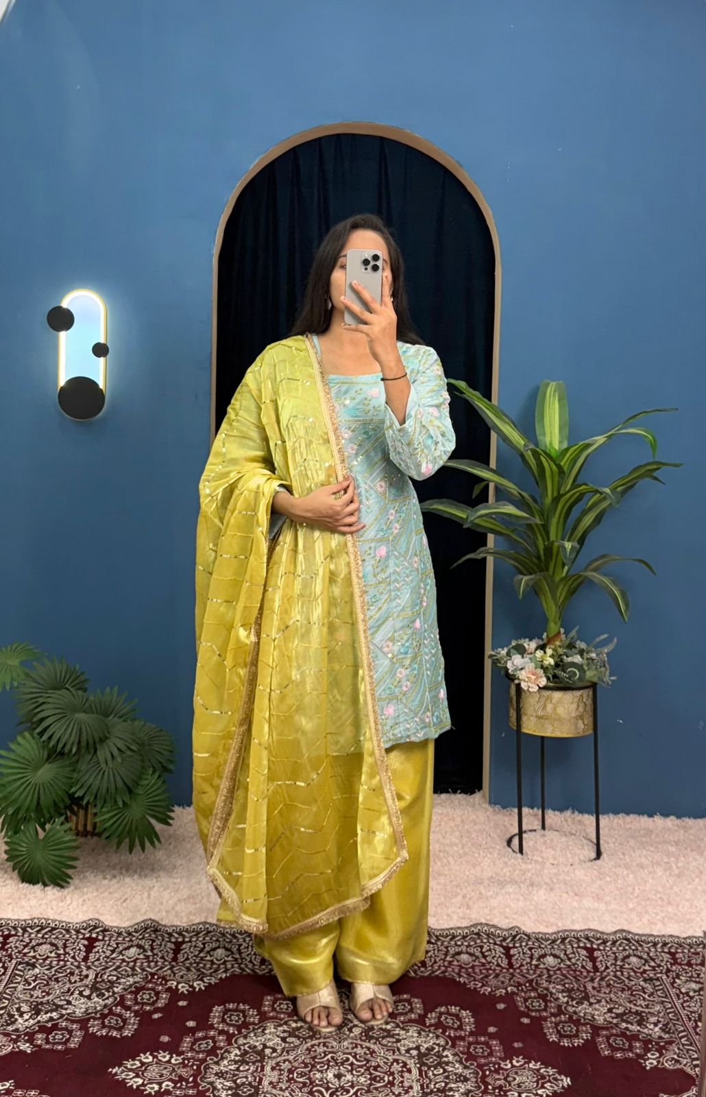 “The salwar suit’s dupatta is generously sized. It can be draped in various styles, adding versatility to the overall ensemble.”
