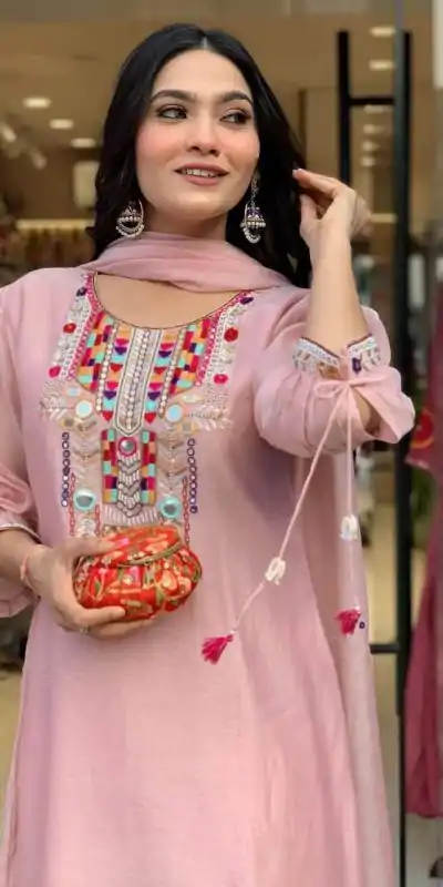 Β Fabrics | Top Fabric : Heavy Chanderi Silk Inner : heavy Cotton Silk Work : Heavy Mirror Work Embroidery pattern features a colorful and detailed design at the neckline and cuffs Length : 47 Inch Size: Free Size Semi Stitched bottom fabric : for comfort and matching the outfit's simplicity pent Length : 40 dupatta : Minimalist embellishments with delicate mirror work embroidery ensuring a balanced aesthetic |