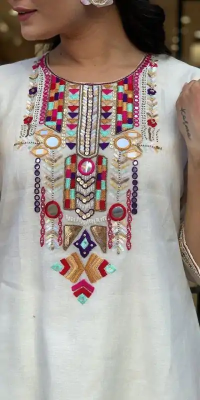 Β Fabrics | Top Fabric : Heavy Chanderi Silk Inner : heavy Cotton Silk Work : Heavy Mirror Work Embroidery pattern features a colorful and detailed design at the neckline and cuffs Length : 47 Inch Size: Free Size Semi Stitched bottom fabric : for comfort and matching the outfit's simplicity pent Length : 40 dupatta : Minimalist embellishments with delicate mirror work embroidery ensuring a balanced aesthetic |
