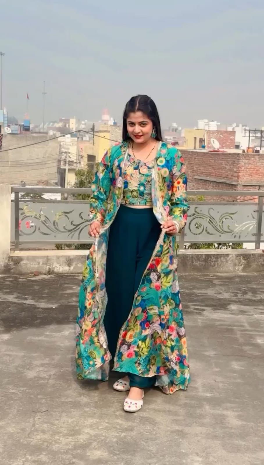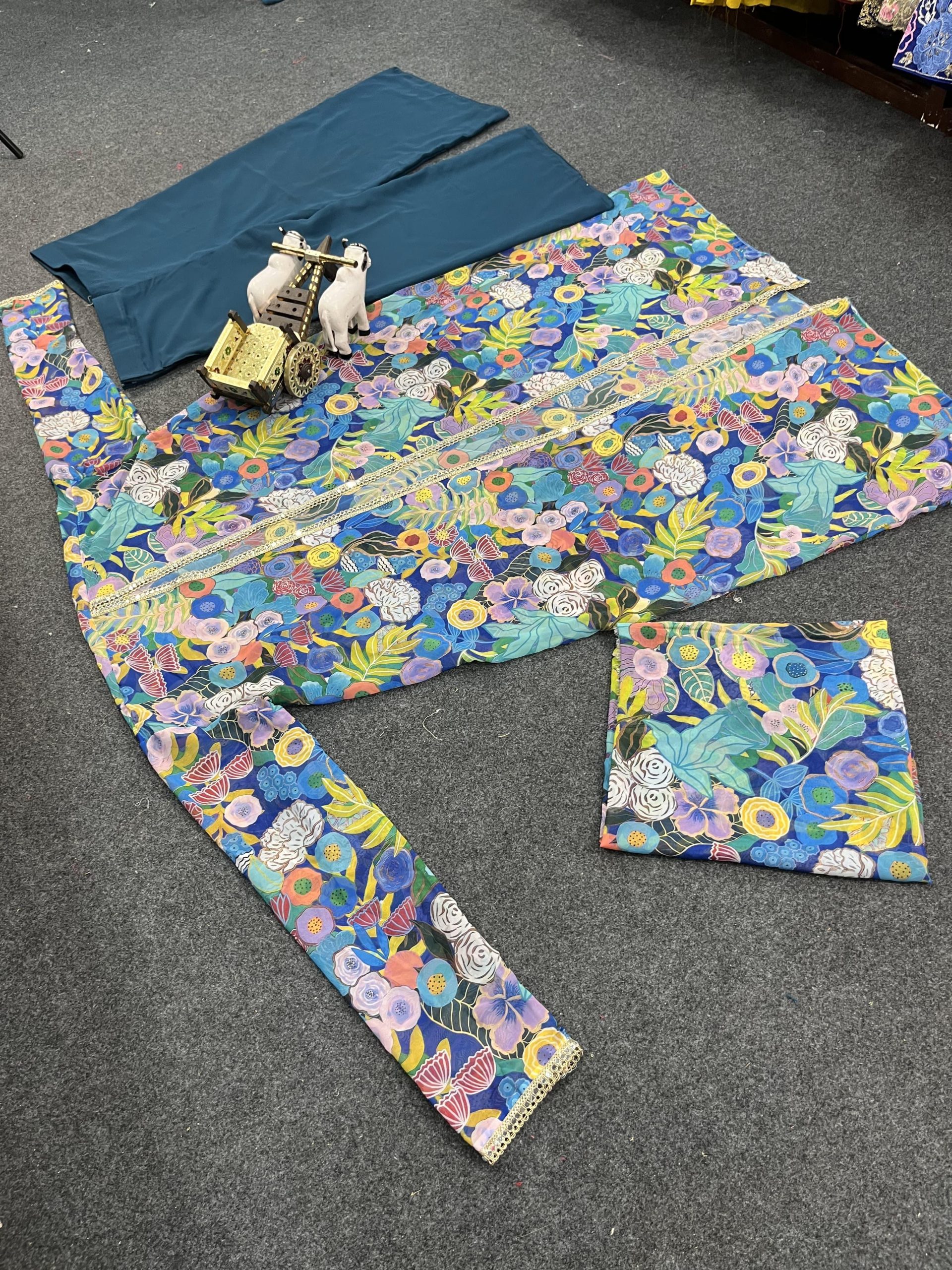 Fabrics | Top Fabric : Fox Georgette Work : Digital Print Work Blouse-Unstitched Top Inner : Heavy Micro Cotton Top Size : Free Size Fully Stitched Ready To Wear Top Length : 38-39 Inch Palazzo Fabrics : Fox Georgette Palazzo Type- Stitched Up to 44 |