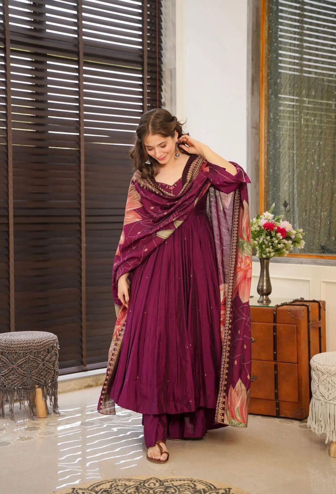 Fabrics | Top :::Pure Chinnon Silk Work : Heavy Embroidery Sequence Work And Full Sleeve Length : 45-46 Inch Inner : Micro Cotton Bottom::Pure Chinnon Silk With Embroidered Sequence Work Bottom Length:40-41 Inch Dupatta : Pure Chinnon Silk Work :Pure Chinnon Silk With Embroidery Sequence Work With Lace Border |