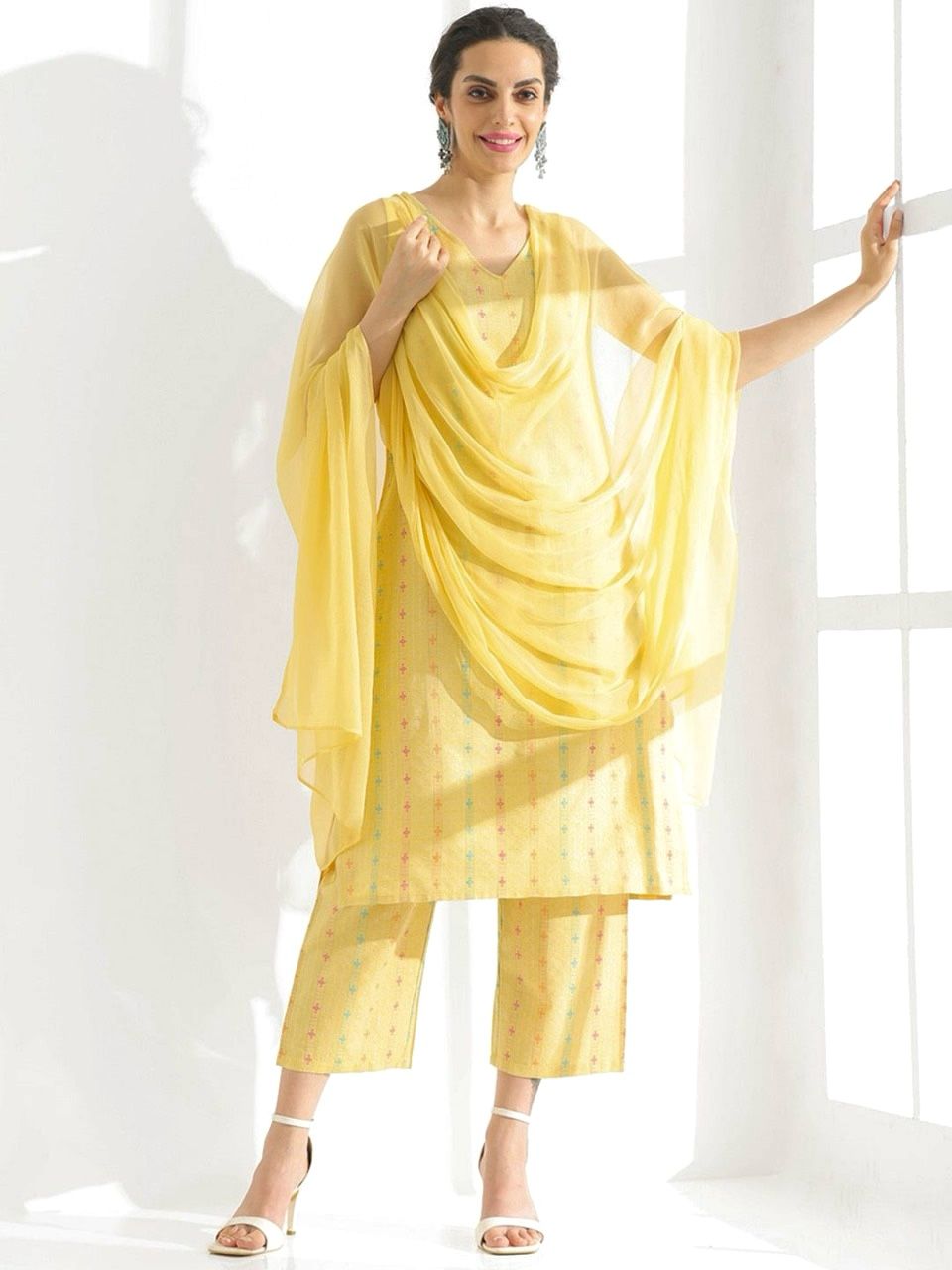 Β Fabrics | Kurti Fabric : Pure Cotton Print Pant : Pure cotton print Elastic waistDupatta Chiffon Dupatta Length : 2.25 mtr Half Sleeves extra fabric inside- Size : Free Size Semi Stitched Length Top : 41