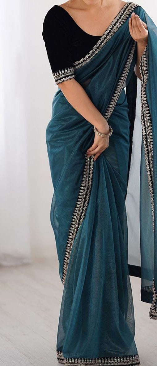 Teal Soft Twil Net Silk Embroidery Work Saree