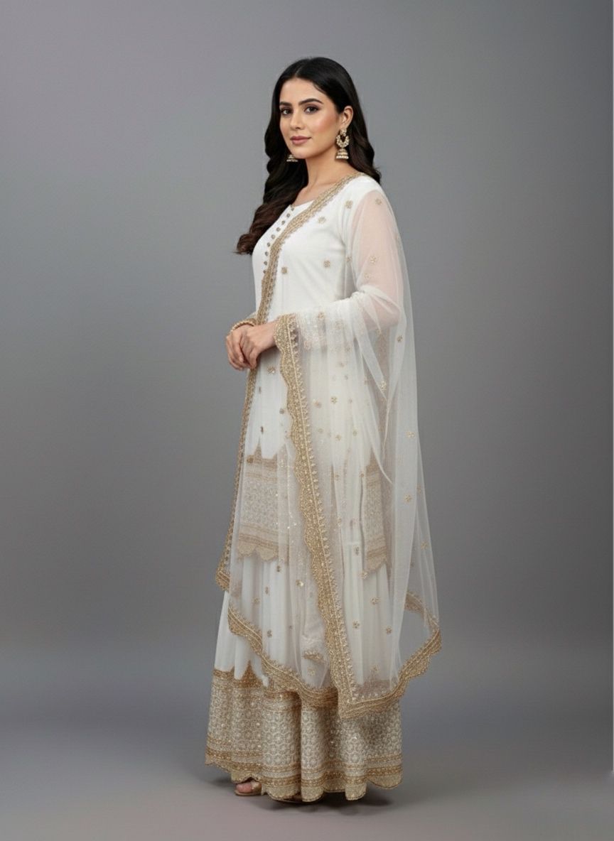 Top : Heavy Faux Georgette With Heavy 5mm Embroidery Sequence Work With Full Sleeve and Potli Button Inner : Heavy Micro cotton Length : 37-38 Inch Size : Free Size Work :Embroidery Sequence Work Type : Semi Stitched Palazzo :Heavy Faux Georgette With 5mm Embroidery Sequence Work With Fully Flair Palazzo inner :Heavy Micro Cotton Palazzo Length:40-41 InchDupatta : Heavy Net With 5mm Embroidery Sequence Work and Lace Border |