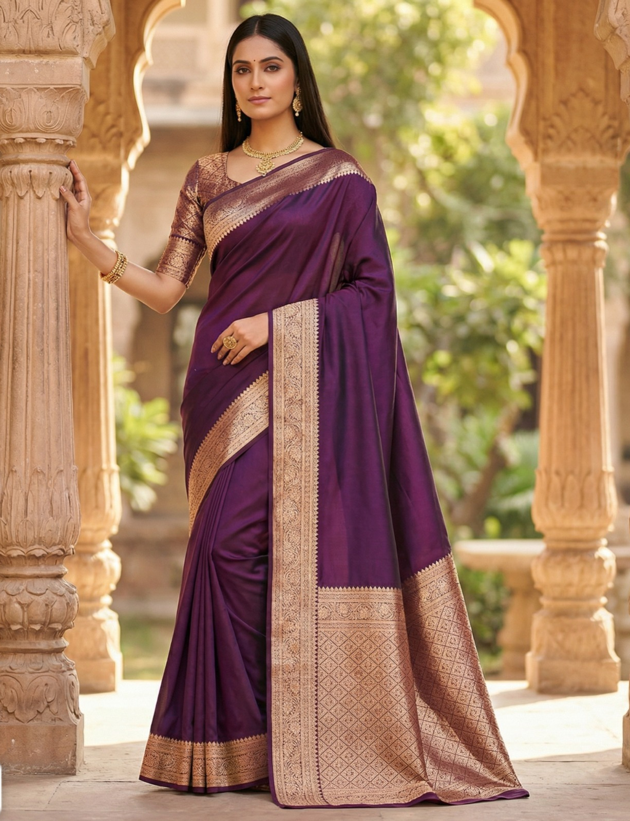 Wine Banarasi Gala Silk Gold Zari Work Saree