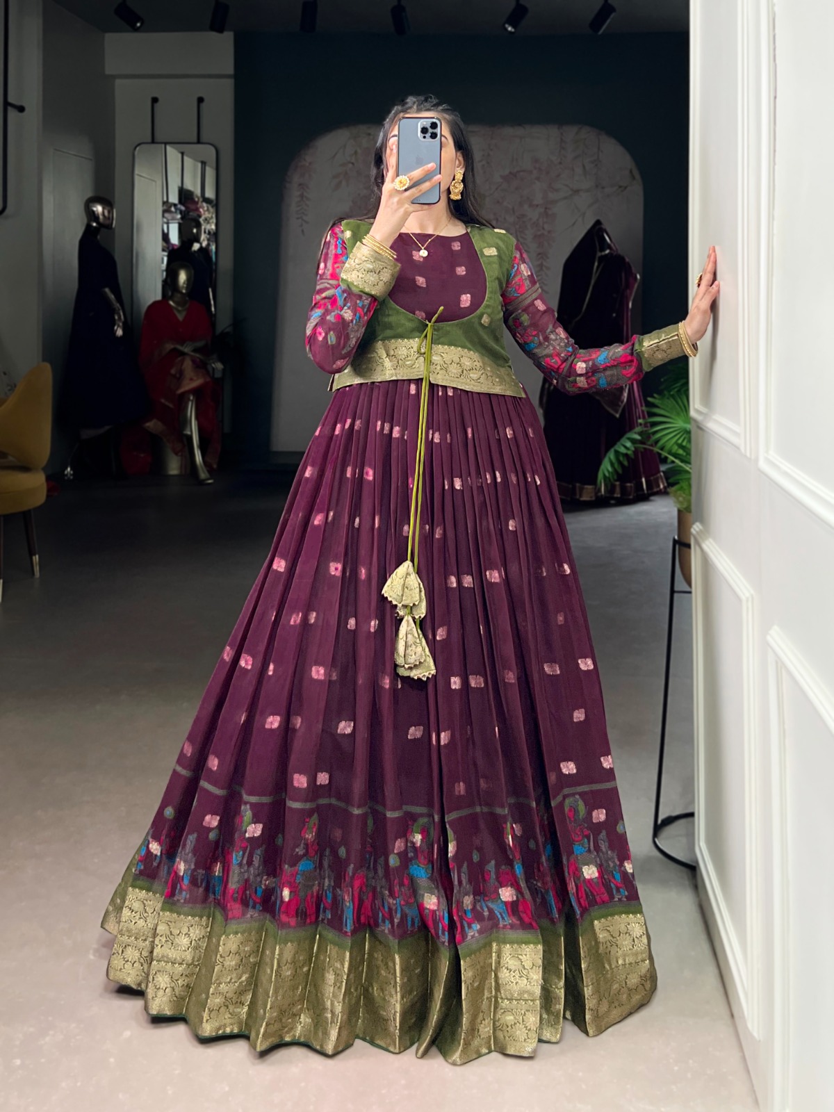 YNF 5031 Wine Color Poly Cotton Kalamkari Print Zari Weaving Work Gown Casual, Wedding, Festive, Events . Expected Delivery  4-6 Working Days @1999/- only      | Gowns, Bollywood Gowns, Creative Gowns, Designer Gowns, Embroidered Gowns, Party Wear Gowns