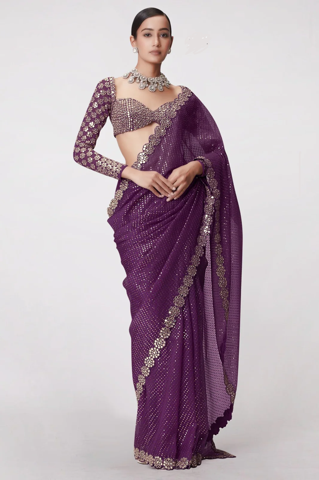Full Saree Of Heavy Quality Faux Georgette Heavy 5mm Sequence Work In Saree Heavy Loading Lace Border In Saree With Original Mirror Stitched BlouseHeavy Faux Georgette Blouse With Heavy Embroidery Front & Back With Sleeves With Heavy Original Mirror Nd Teasels Attached In Sleeves Blouse Size-42+margin Handwork Details Original Mirror Work Done In Lace Border,blouse & Sleeves |