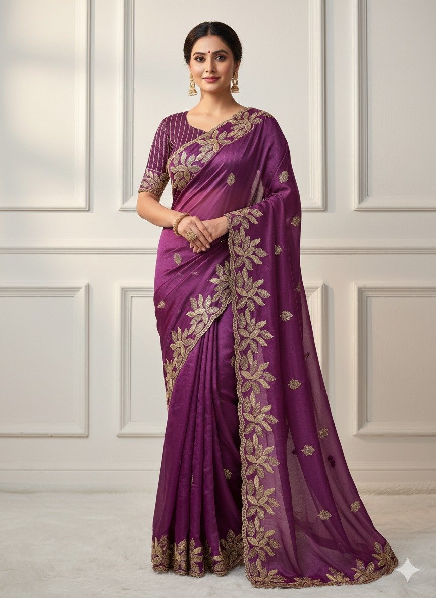 Wine Soft Organza Silk With Sequins Work Saree